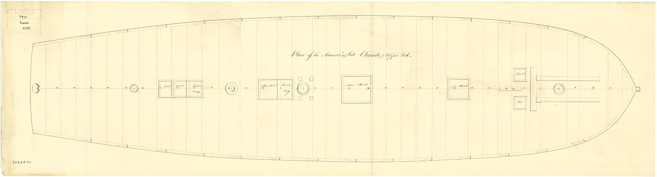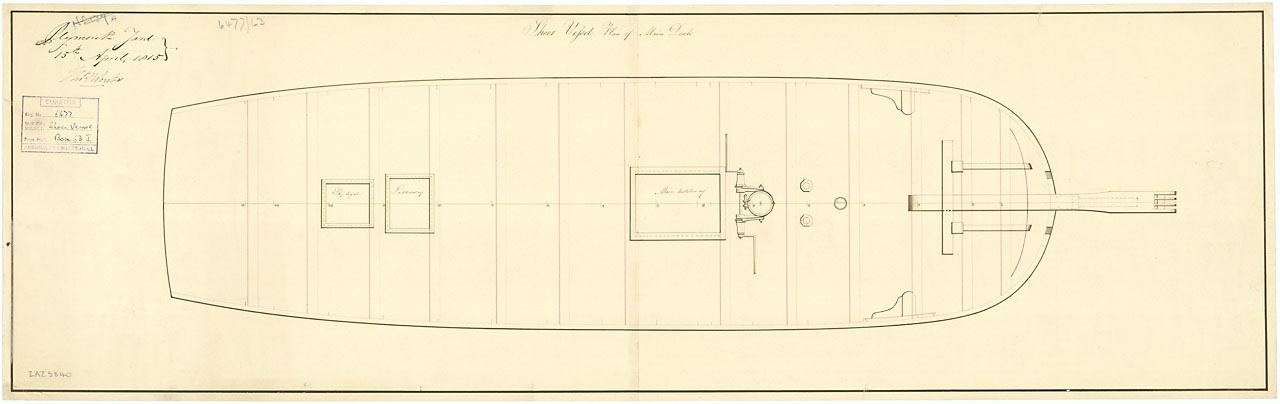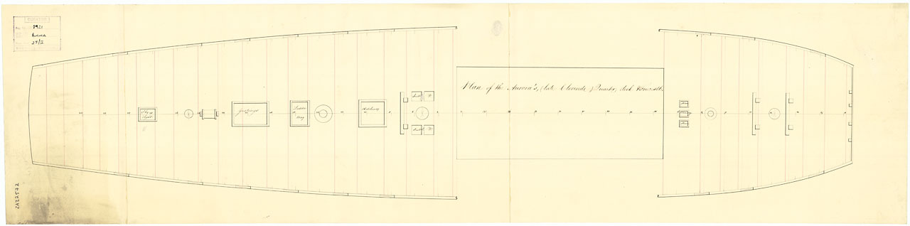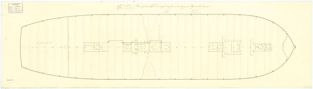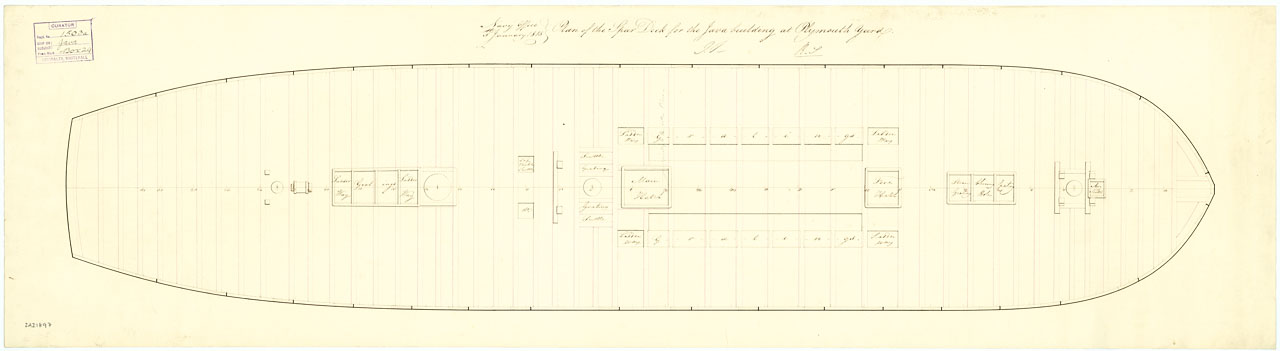 Java (1815). Scale: 1:48. Plan showing the upper deck for Java (1815), a 52-gun Fourth Rate, large Frigate, building at Plymouth Dockyard.