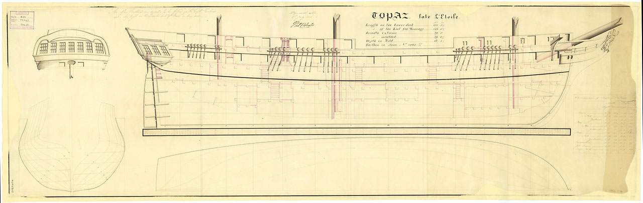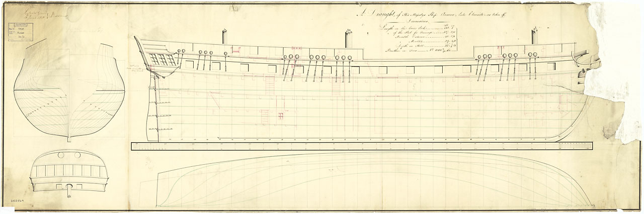 Canopus (1798). Scale: 1:48. Plan showing the profile (no waterlines) with figurehead for Canopus (1798), a captured French Third Rate, as fitted as a 80-gun Third Rate, two-decker. The plan illustrates her as taken off at Plymouth prior to underegoing r