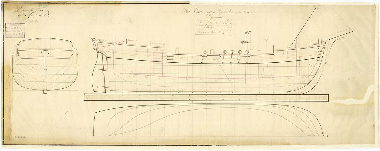 NMM, Progress Book, volume 6, folio 303, states that 'Sibelle' arrived at Woolwich Dockyard in March 1815 and wasdocked in April, where she was housed over. After recoppering between April and July 1815 she was undocked