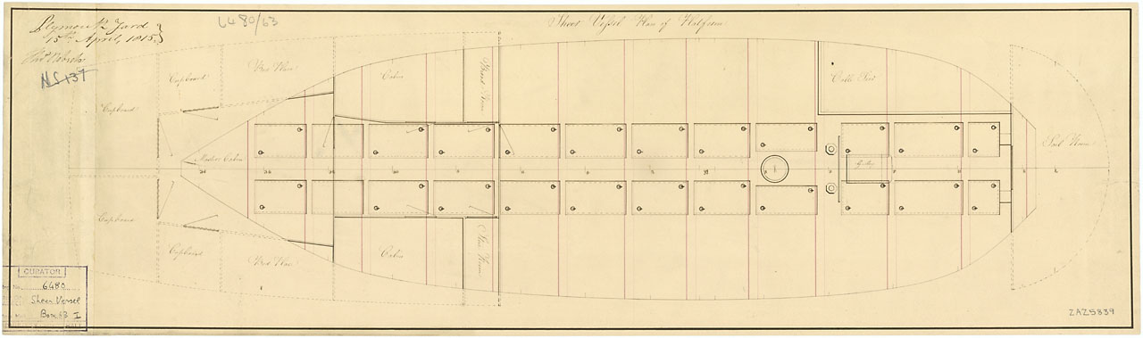 Gibraltar (captured 1780). Scale: 1:48. Plan showing the inboard profile with some outboard detail for Gibraltar (captured 1780), a captured Spanish Third Rate, two-decker, as cut down and fitted for use as a Powder Hulk at Plymouth Dockyard in 1813.
