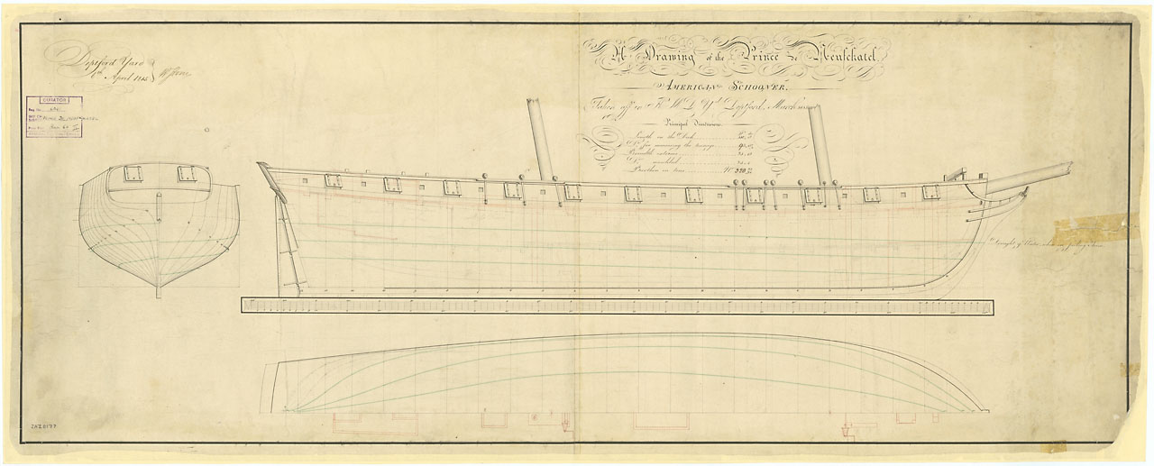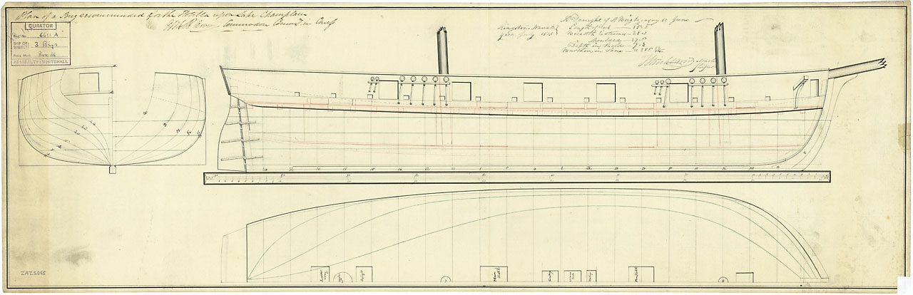 Princess Charlotte (1814). Scale: 1:96. Plan showing the body plan, sheer lines with inboard detail, and longitudinal half-breadth for Princess Charlotte (1814), a 42-gun Fifth Rate Frigate, as built at Kingston Naval Yard for use on the Lakes.