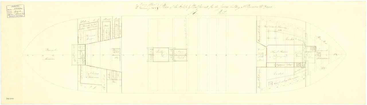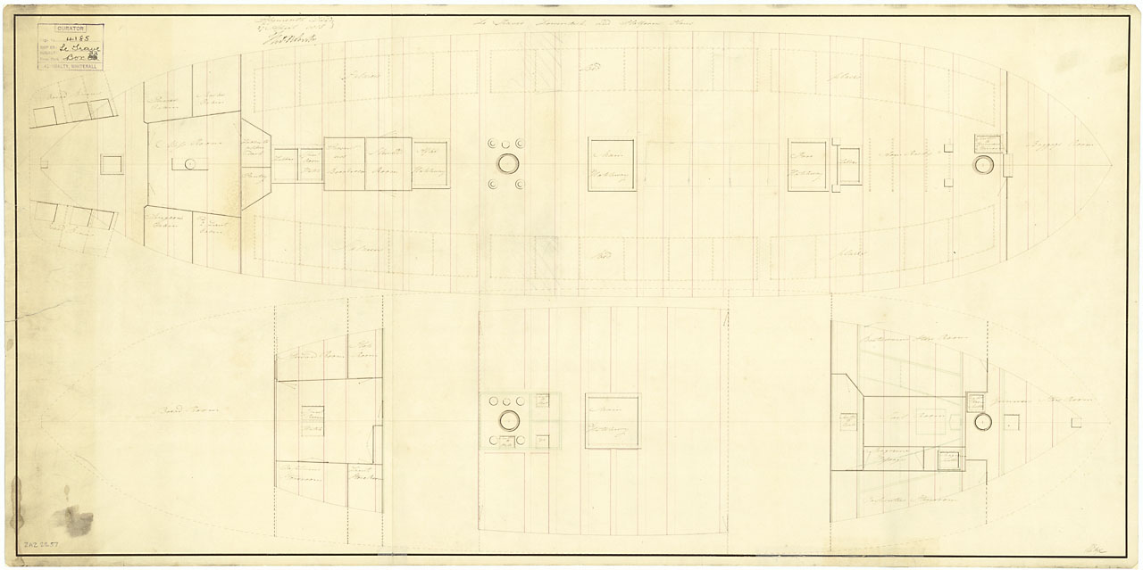 Gibraltar (captured 1780). Scale: 1:48. Plan showing the lower deck for Gibraltar (captured 1780), a captured Spanish Third Rate, two-decker, as fitted for use as a Powder Hulk at Plymouth Dockyard in 1813. The lower deck used to be the orlop deck when sh