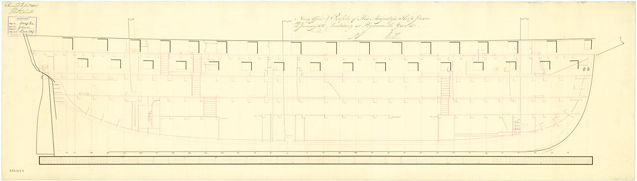 Java (1815). Scale: 1:48. Plan showing the inboard profile for Java (1815), a 52-gun Fourth Rate, large Frigate building at Plymouth Dockyard. The plan was received and signed by Thomas Roberts, Master Shipwright at Plymouth Dockyard, on 11 January 181