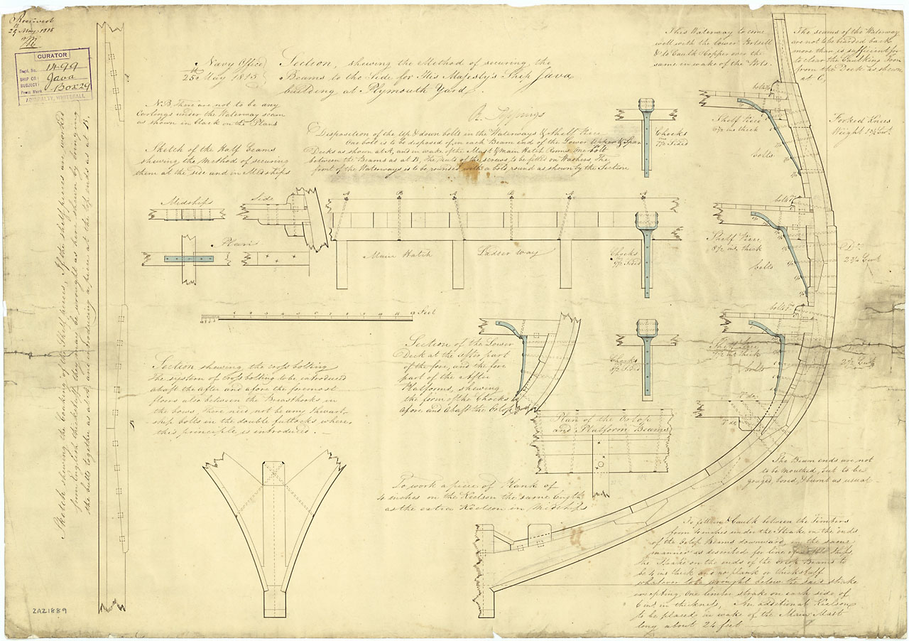 Java (1815). Scale: 1:24. Plan showing a section with plans and details of the bolts and iron knees illustrating the method of securing the beams to the sides for Java (1815), a 52-gun Fourth Rate, large Frigate, building at Plymouth Dockyard.