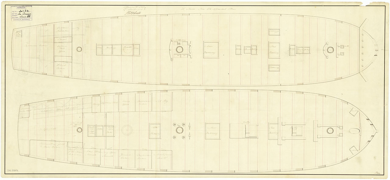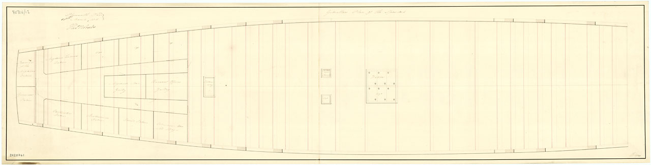 Gibraltar (captured 1780). Scale: 1:48. Plan showing the spar deck for Gibraltar (captured 1780), a captured Spanish Third Rate, two-decker, as fitted for use as a Powder Hulk at Plymouth Dockyard in 1813. The spar deck used to be the upper deck when she