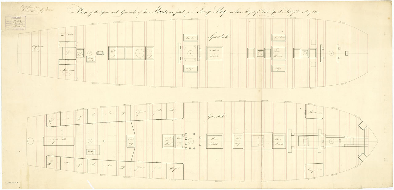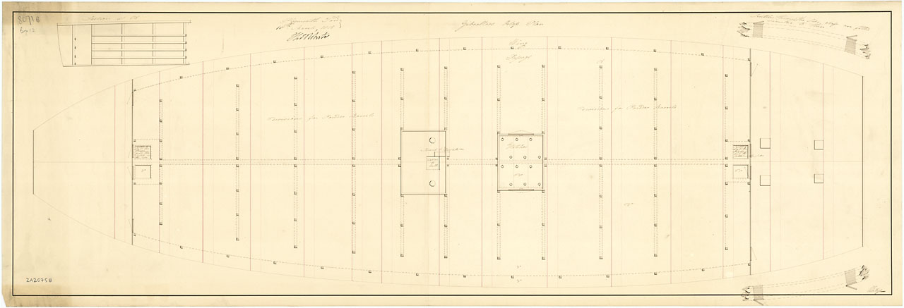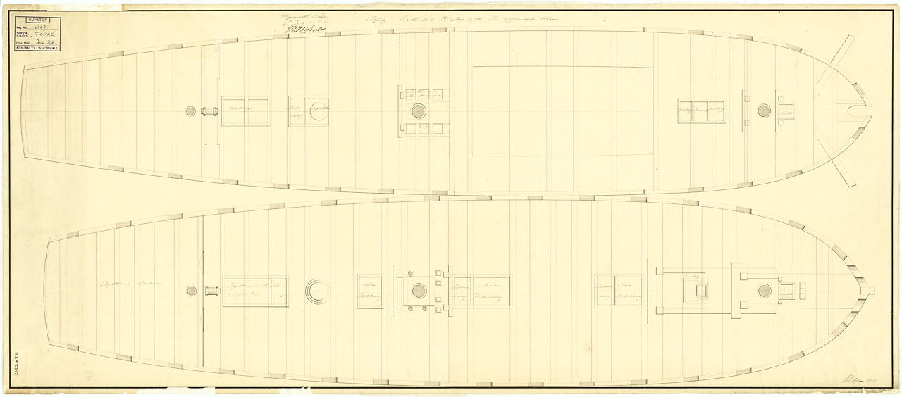 Gibraltar (captured 1780). Scale: 1:48. Plan showing the upper deck for Gibraltar (captured 1780), a captured Spanish Third Rate, two-decker, as fitted for use as a Powder Hulk at Plymouth Dockyard in 1813. The upper deck used to be the lower deck when sh