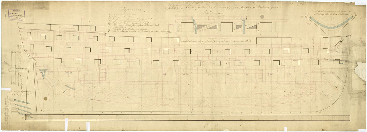 Saint Lawrence (1814). Scale: 1:48. Plan showing a section and part profile illustrating the method of fixing the decks to the sides for Saint Lawrence (1814), a 112-gun First Rate, three-decker, as built at Kingston Naval Yard.