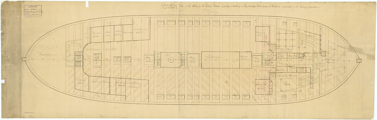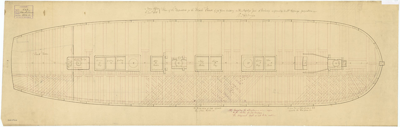 'Black Prince' (1816). Scale: 1:48. Plan showing the upper deck illustrating diagonal decking and diagonal carlines for 'Black Prince' (1816), a 74-gun Third Rate, two-decker, building at Woolwich Dockyard.