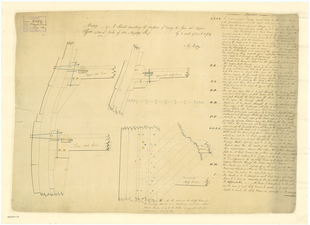 Agincourt (1813), and for unspecified 74-gun Ships.. Scale: 1:24. Plan showing a section, part inboard elevation and part deck plan illustrating the method of fixing the beams, riders and trusses, as well as the diagonal carlines and deck planking for 74-