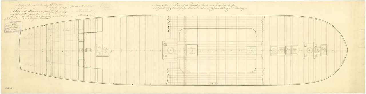 'Malabar' (1818), 'Talavera' (1818), 'Belleisle' (1819). Scale 1:48. Plan showing the quarterdeck and forecastle for 'Malabar' (1818), with alterations for 'Talavera' (1818) and 'Belleisle' (1819
