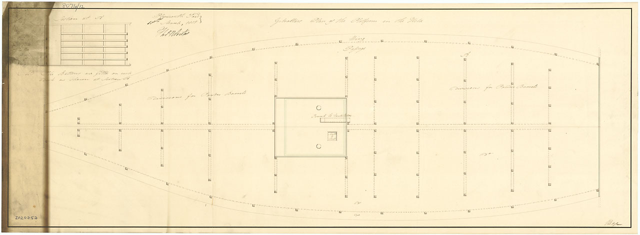 Gibraltar (captured 1780). Scale: 1:48. Plan showing the platform in the hold for Gibraltar (captured 1780), a captured Spanish Third Rate, two-decker, as fitted for use as a Powder Hulk at Plymouth Dockyard in 1813. The plan illustrates the storage divis