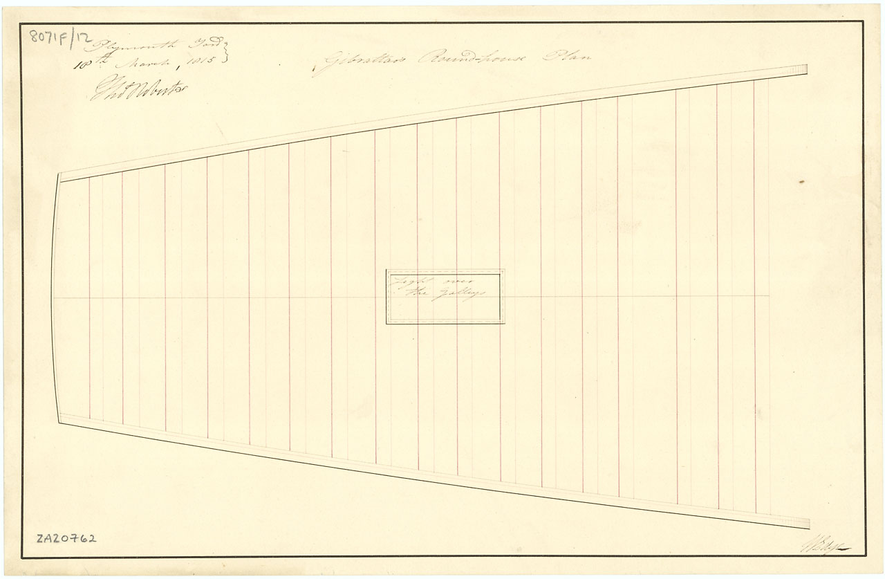 Gibraltar (captured 1780). Scale: 1:48. Plan showing the roundhouse for Gibraltar (captured 1780), a captured Spanish Third Rate, two-decker, as fitted for use as a Powder Hulk at Plymouth Dockyard in 1813. The roundhouse was part of the quarterdeck when