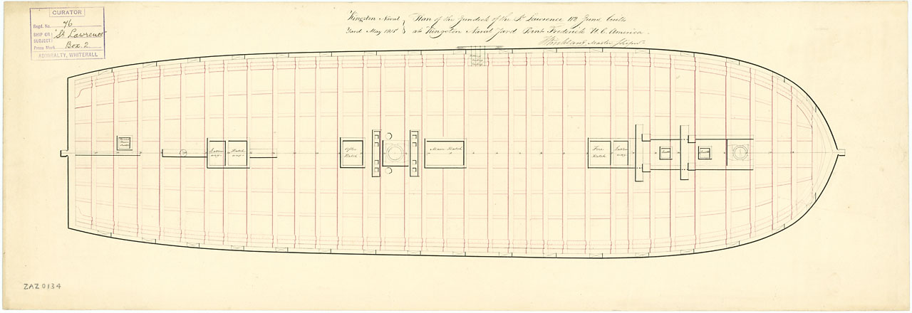 Saint Lawrence (1814). Scale: 1:96. Plan showing the gun deck (lower deck) for Saint Lawrence (1814), a 112-gun First Rate, three-decker, as built at Kingston Naval Yard.