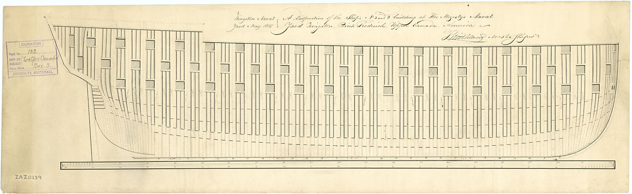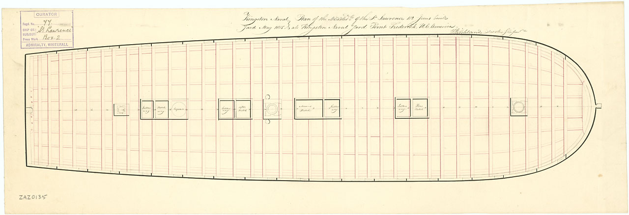 Saint Lawrence (1814). Scale: 1:96. Plan showing the inboard profile for Saint Lawrence (1814), a 112-gun First Rate, three-decker, as built at Kingston Naval Yard.