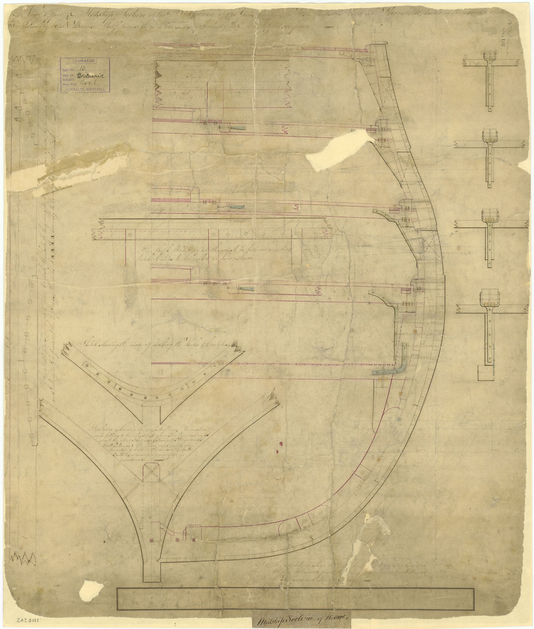 Britannia (1820); Howe (1815). Scale: 1:24. Plan showing the midship section with details illustrating the manner of attaching the beams and shelf pieces to the sides on Britannia (1820), a 120-gun First Rate, three-decker. The plan was to Robert Seppin