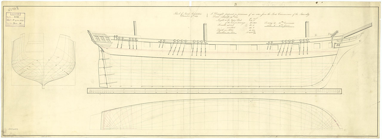 Alarm (cancelled 1826), Nimrod (1828) (ex Andromeda). Scale 1:48. Plan showing the inboard profile plan, with alterations for building Alarm (cancelled 1826), Nimrod (1828) (under original name of Andromeda), both originally 28-gun, Sixth Rate Frigates,