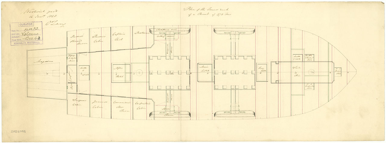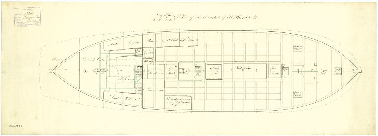 Favorite (1829); Hyacinth (1829); Racehorse (1830); Hazard (1837). Scale: 1:48. Plan showing the lower deck for Favorite (1829), Hyacinth (1829), Racehorse (1830) and Hazard (1837), all 18-gun flush-decked Ship Sloops.