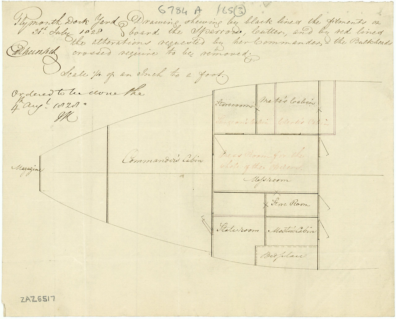 Sparrow (1828). Scale 1:48. Plan showing the after part of the lower deck for Sparrow (1828), a 10-gun Cutter, illustrating the alterations to the cabin bulkheads as proposed by Lieutenant Commander John Moffatt [appointed: 18 July 1828; Lieutenant senio