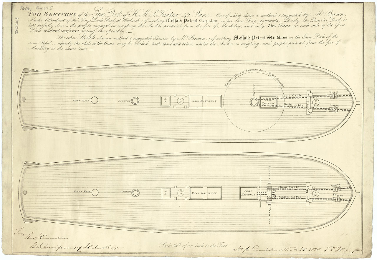 Tartar (1814). Scale: 1:96. Plan showing the upper deck for Tartar, a 42-gun Large Frigate, illustrating the method of working the Moffat Patent Capstan, and another plan of the upper deck illustrating the working of the Moffat Patent Windlass (as sugges