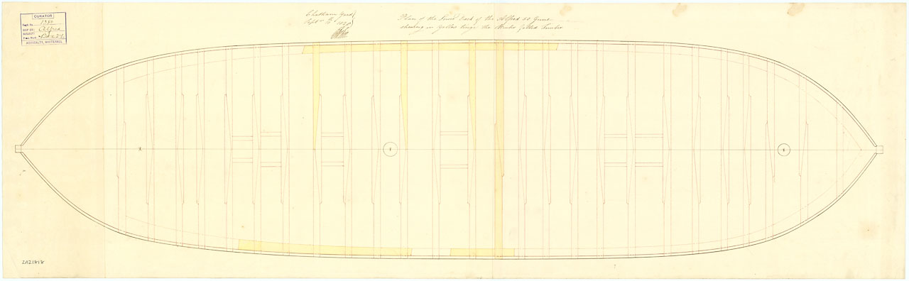 Asia (1811), renamed Alfred (1819). Scale: 1:48. Plan showing the lower deck for 'Asia' (1811), a 74-gun Third Rate, two-decker, as cut down to a 50-gun Fourth Rate, Frigate at Chatham Dockyard. The plan refers to the 'Asia' under he