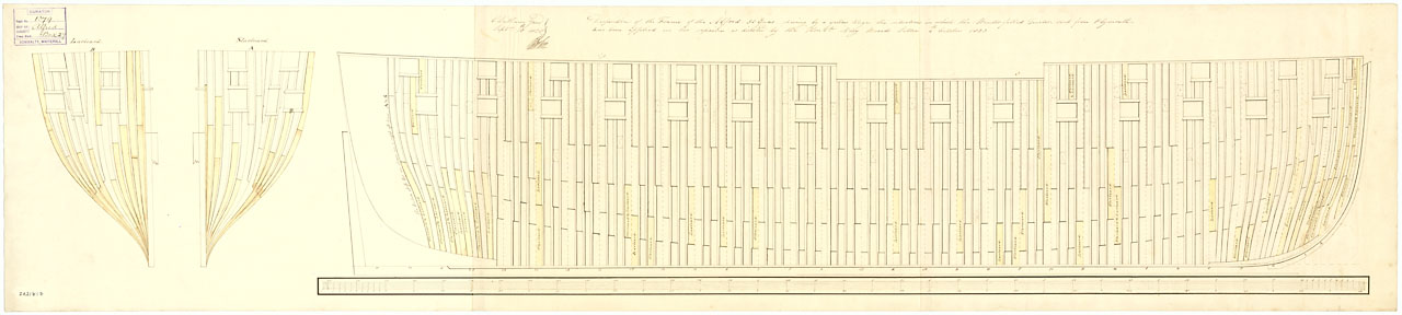 Indus (1839). Scale: 1:48. Plan showing the inboard profile for Indus (1839), an 80-gun Second Rate, two-decker. The plan was later altered in April 1834 and again in July 1838. It is also a copy of ZAZ0444.