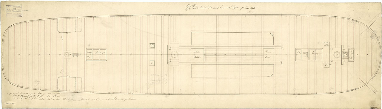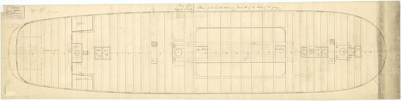 Indus (1839). Scale: 1:48. Plan showing the quarterdeck and forecastle for Indus (1839), an 80-gun Second Rate, two-decker. The plan was altered to reflect the Indus 'as built' at Portsmouth Dockyard, which had been approved on 19 September 18