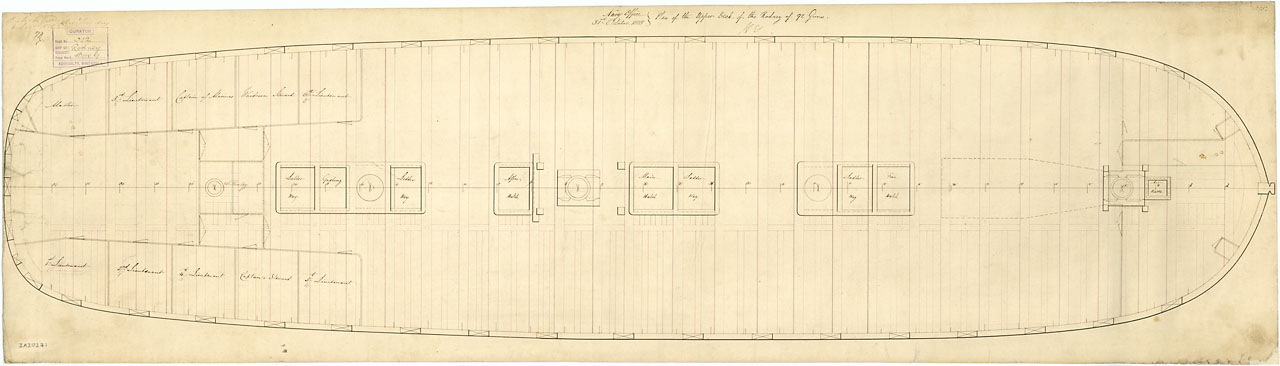 'Rodney' (1833). Scale 1:48. Plan showing the upper deck for 'Rodney' (1833), a 92-gun Second Rate, two-decker.