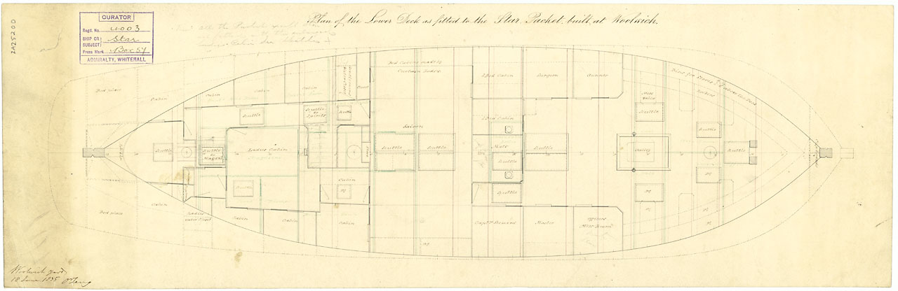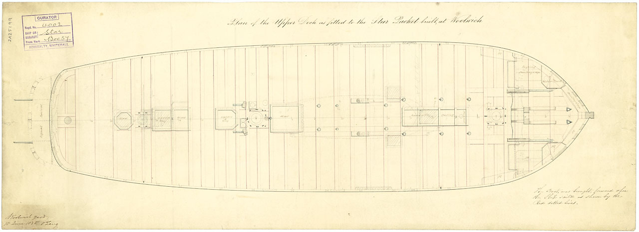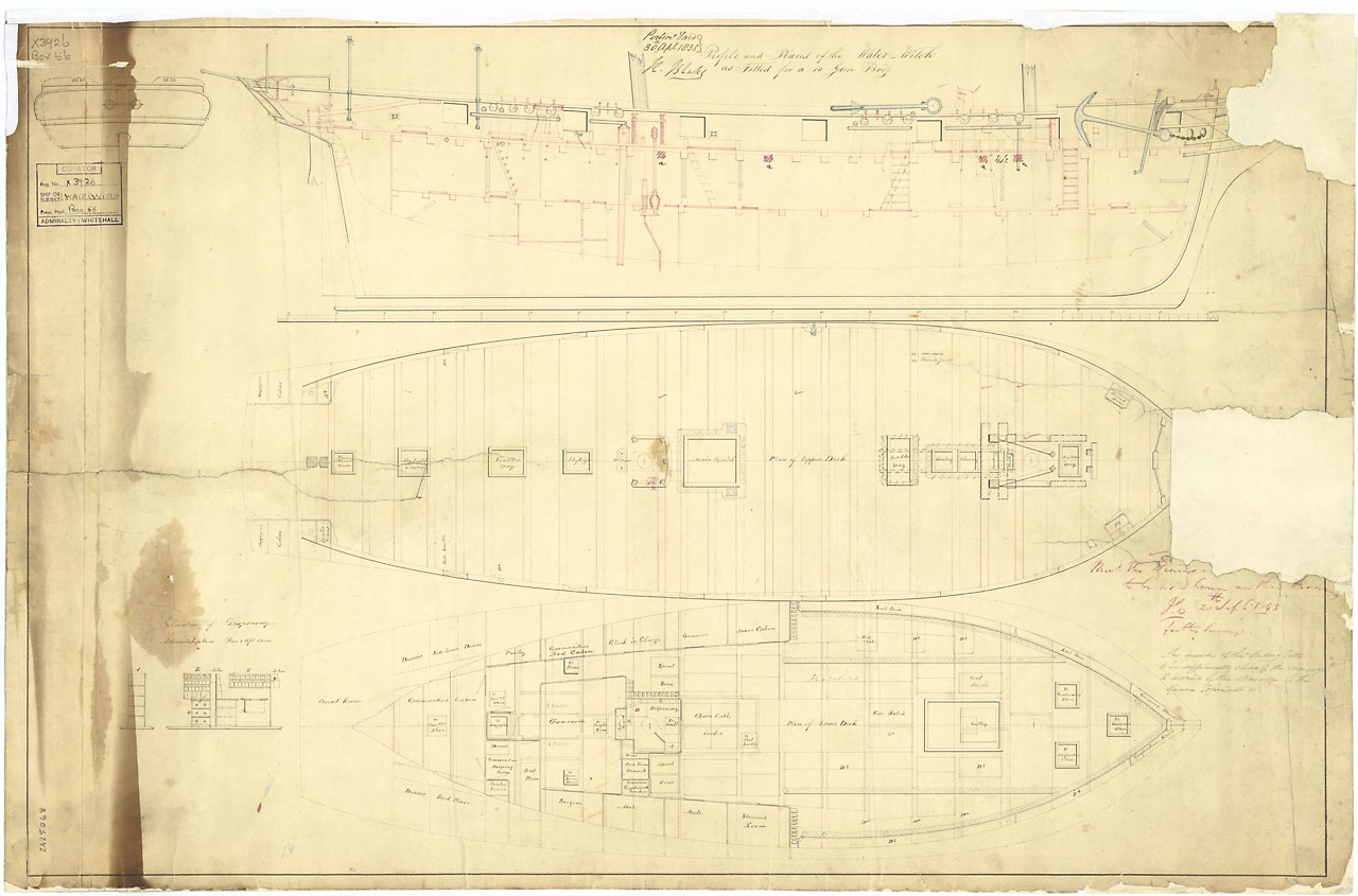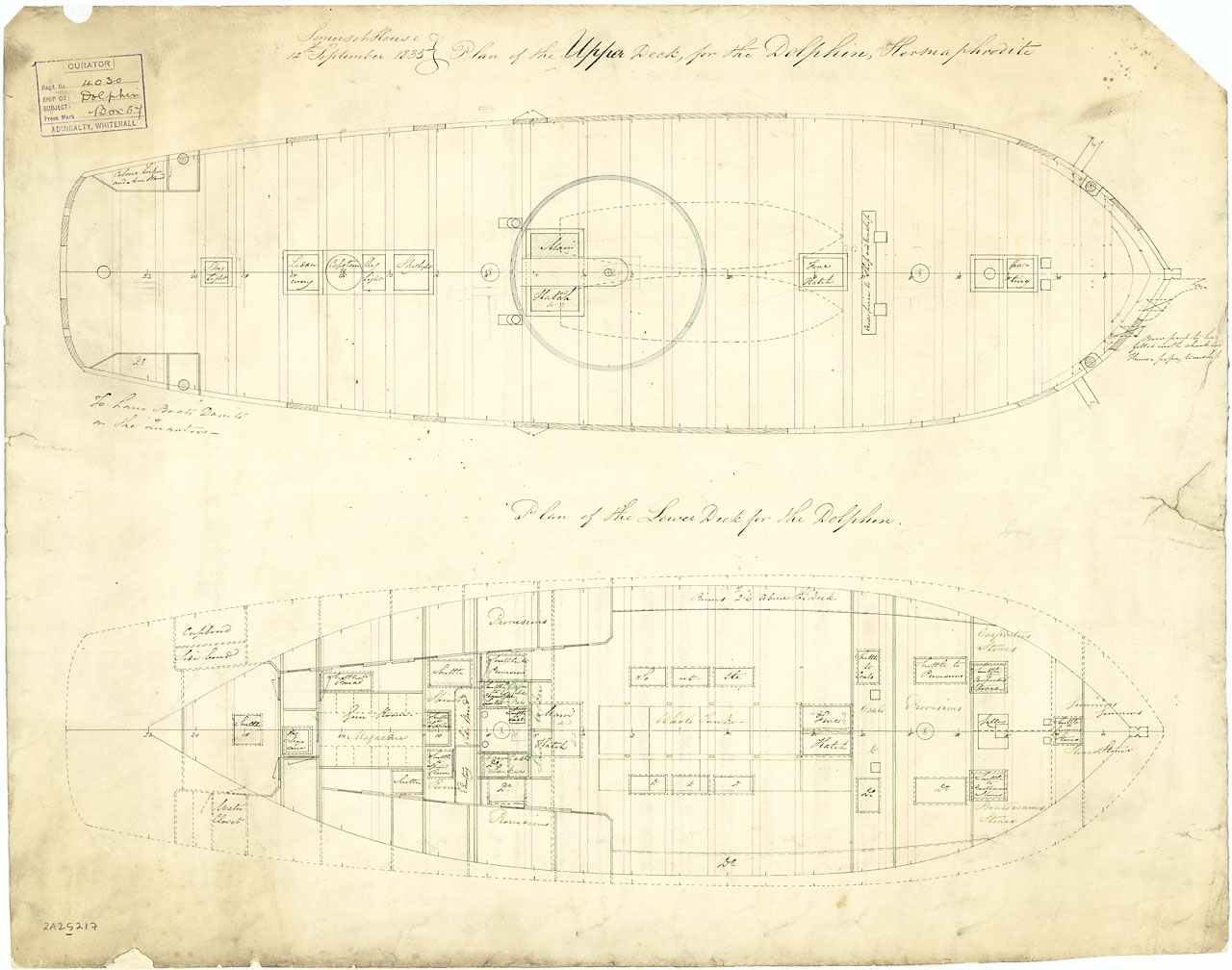 Violet (1835). Scale: 1:48. Plan showing the upper deck, and lower deck for Violet (1835), a Tender to HMS Survey Sloop Fairy (1826), as taken off at Sheerness Dockyard Signed T (or J) Sturdee [possibly Assistant to the Master Shipwright?].