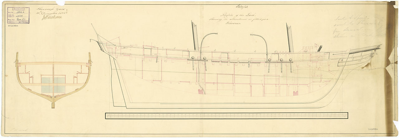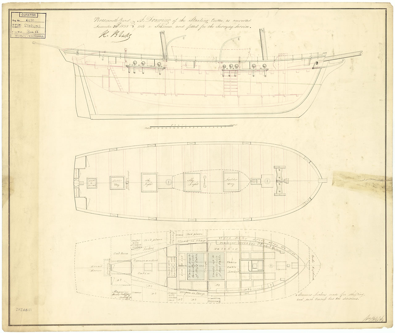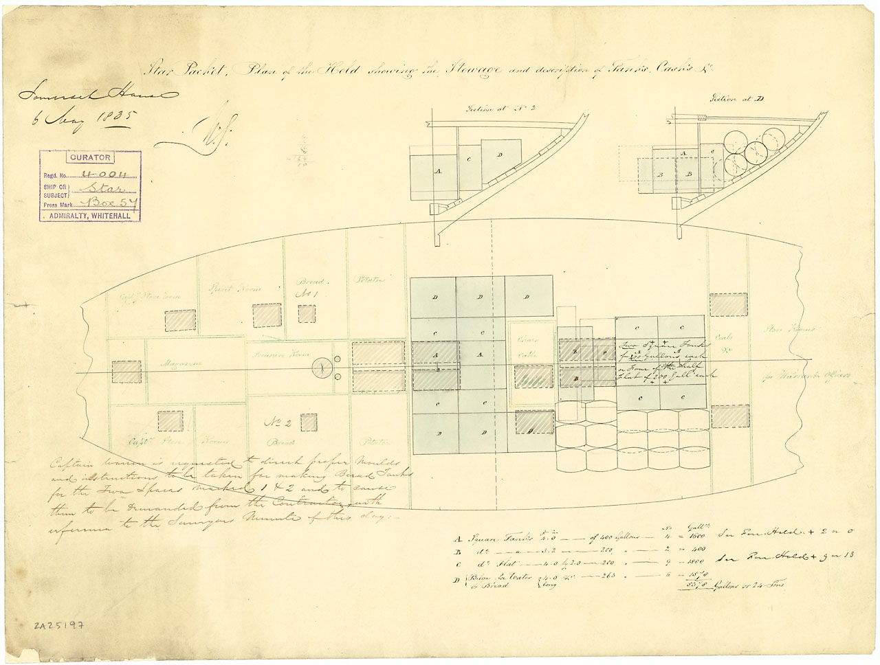 Violet (1835). Scale: 1:48. Plan showing the upper deck, and lower deck for Violet (1835), a Tender to HMS Survey Sloop Fairy (1826), as taken off at Sheerness Dockyard Signed T (or J) Sturdee [possibly Assistant to the Master Shipwright?].