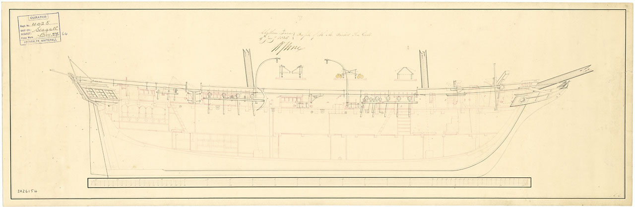 Calypso (1845); Coquette (cancelled 1851). Scale: 1:48. Plan showing the main deck for Calypso (1845) and Coquette (cancelled 1851), both 18-gun flush-decked Sixth Rate corvettes. The date was amended to June 1842.