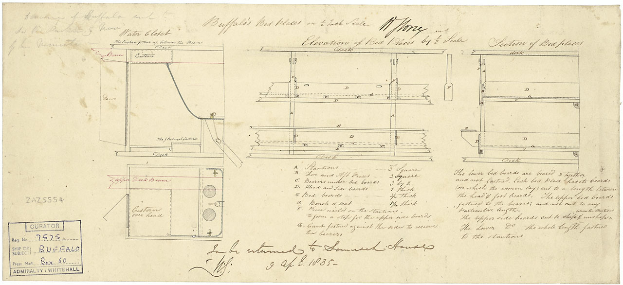 'Buffalo' (1813). Scale: 1:24. Plan showing the section and elevation of bed spaces and water closet for 'Buffalo' (1813), a purchased East Indiaman, as fitted as an emigrant ship to Australia.