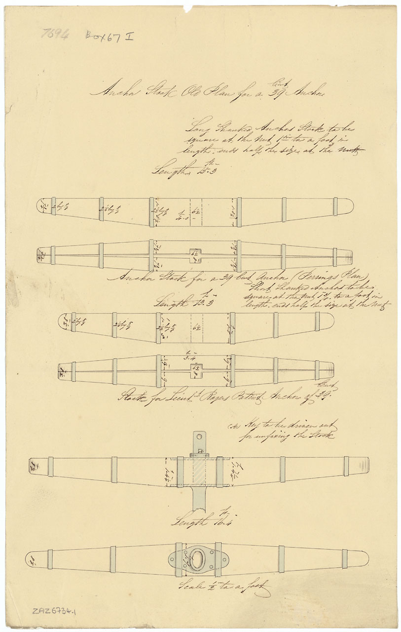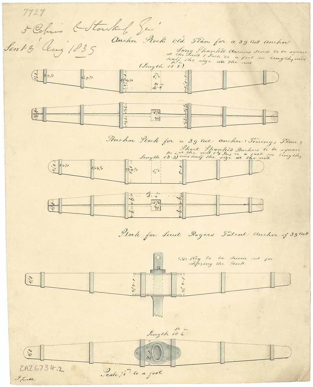 Two anchor stock designs for a 39 cwt anchor. Scale: 1:24. Plan showing the elevation sections and plans for the Perring design of anchor stock and the patent design by Lieutenant Roger.
