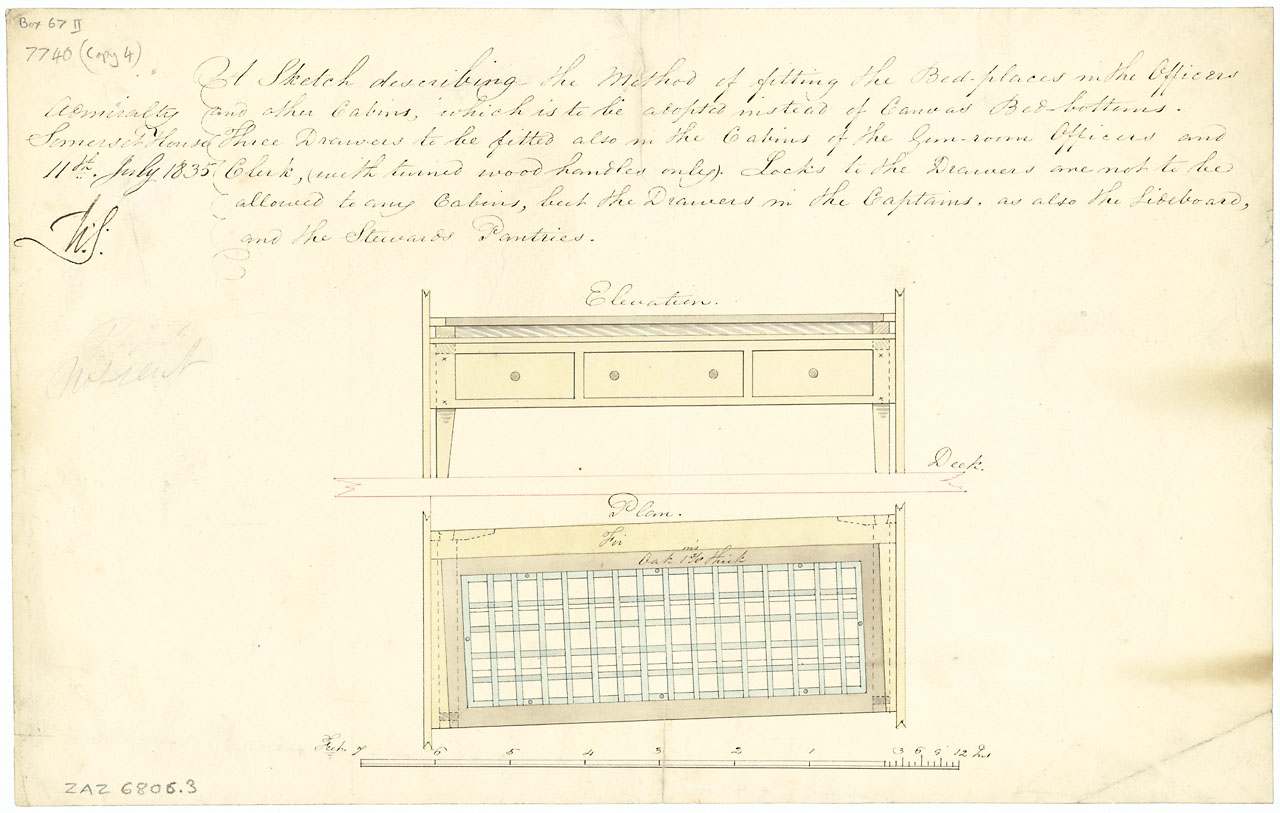 Bed places for officers and other cabins (circa 1835). Scale: 1:12. Plan showing elevation and plan of the method for fitting bed spaces in officers and others cabins to replace canvas bed-bottoms. Pencil annotation states this was not sent. See annota