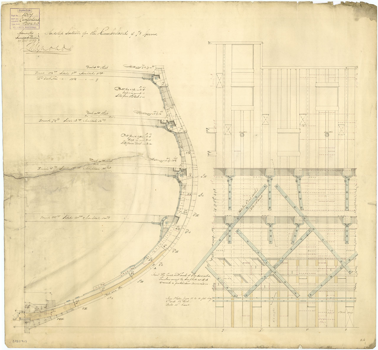 'Cumberland' (1842). Scale: 1:24. Plan showing the half midship section, and midship framing illustrating the securing of the beams and riders for 'Cumberland' (1842), a 70-gun Third Rate, two-decker.