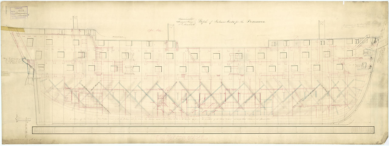 'Boscawen' (1844). Scale: 1:48. Plan showing the inboard profile, with later alterations, for 'Boscawen' (1844), a 70-gun Third Rate, two-decker, building at Woolwoich Dockyard.
