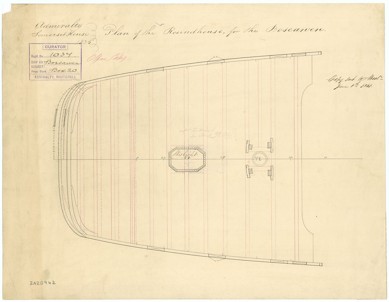 'Boscawen' (1844). Scale: 1:48. An Office Copy plan showing the roundhouse, with alterations, for 'Boscawen' (1844), a 70-gun Third Rate, two-decker, building at Woolwich Dockyard. Plan ZAZ0941 shows the roundhouse after these alterati