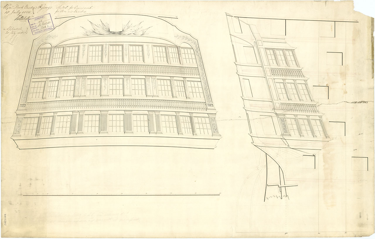 'Saint George' (1840). Scale: 1:48. Plan showing the sternboard outline with decoration detail, stern quarter decoration, and a faint outline of the circular stern half-breadth proposed (and approved) for 'Saint George' (1840), a 120-g
