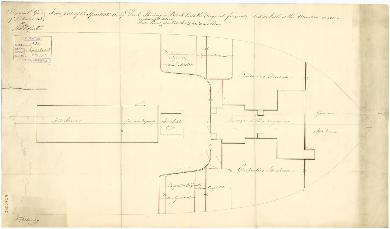 Spartiate (captured 1798). Scale: 1:48. Plan showing the fore part of the orlop deck for Spartiate (captured 1798), a captured French Third Rate. The vessel was refitted between 1801-1803 as a 74-gun Third Rate, two-decker. The plan illustrates the origin