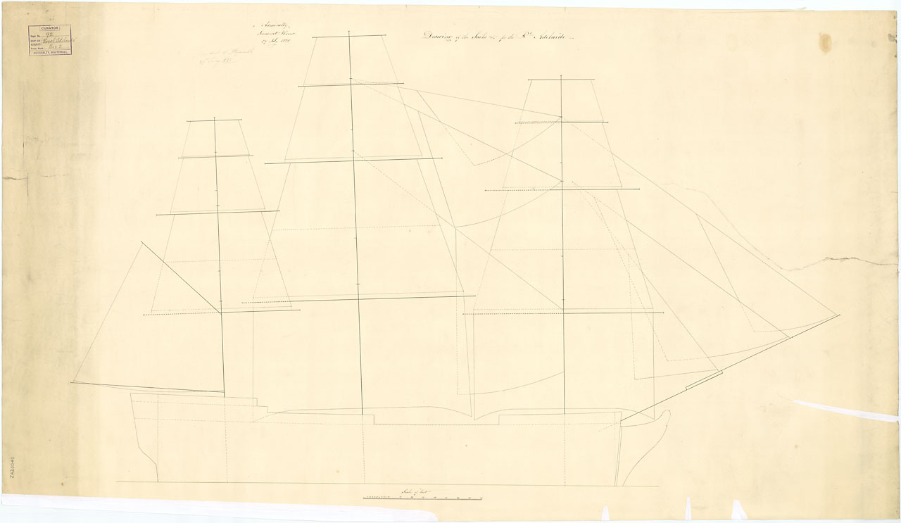 'Royal Adelaide' (1828). Scale: 1:96. Plan showing the sail and spar plan for Royal Adelaide (1828), a 100/110-gun, First Rate, three-decker.
