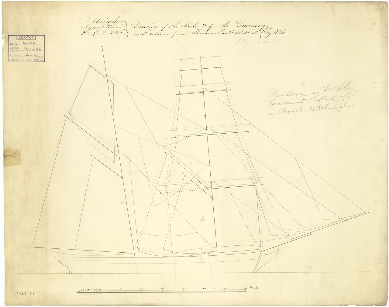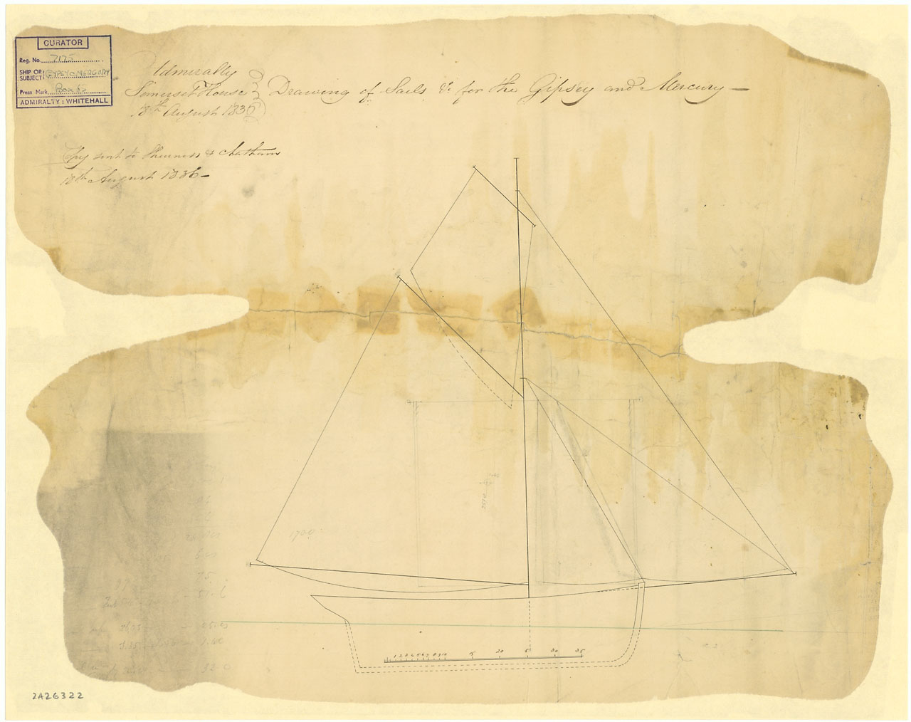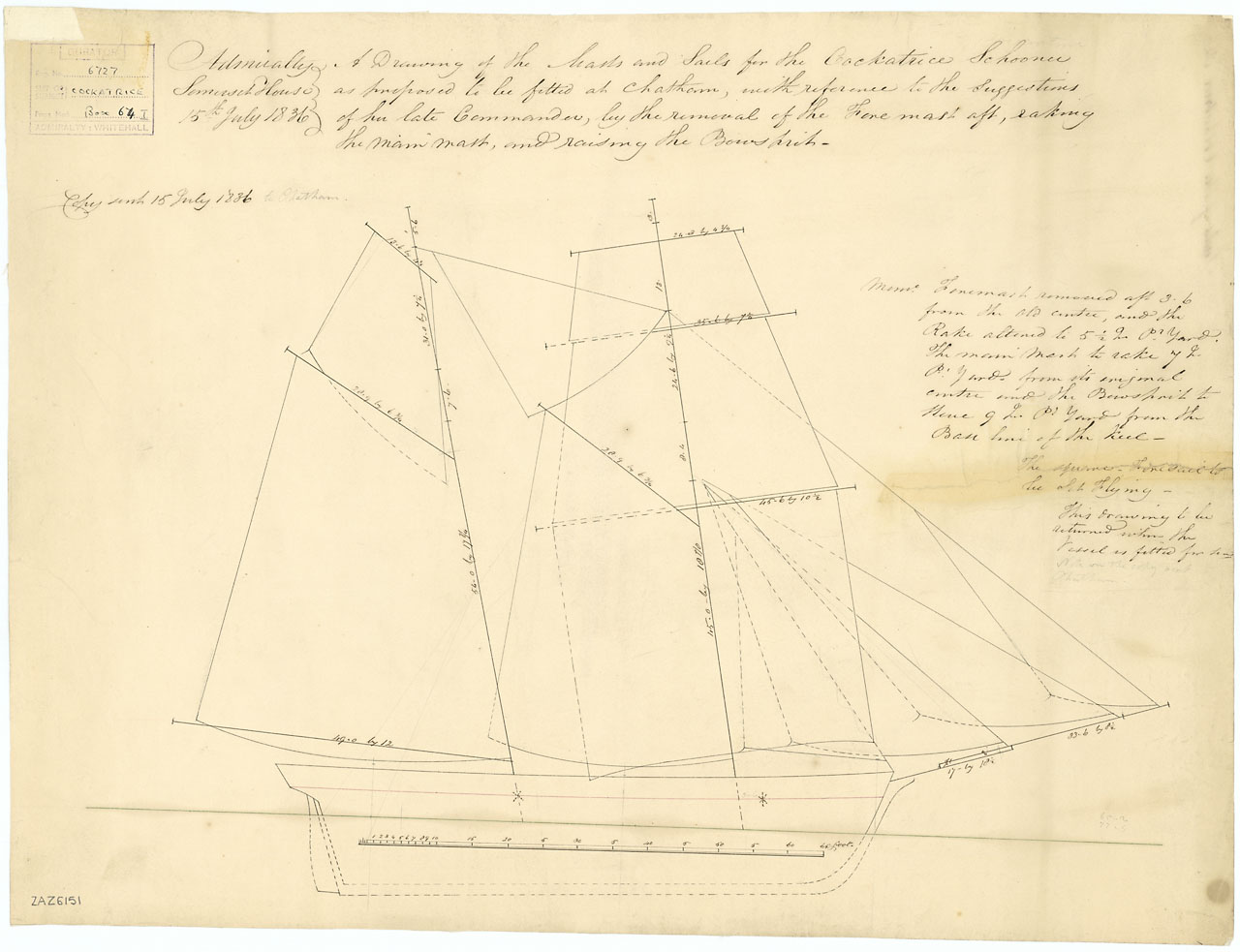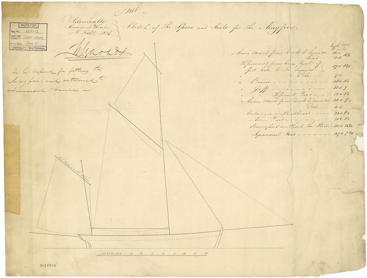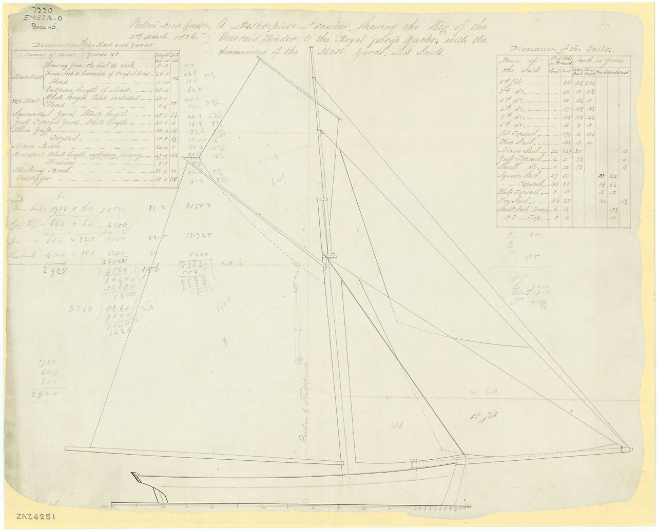 Emerald (1820). Scale: 1:96. Plan showing the sail plan for Emerald (1820), a purchased Cutter Tender to the Royal George (1817), a Royal Yacht, as fitted[?] at Portsmouth Dockyard. The plan includes a table of the mast & yard dimensions, and the a