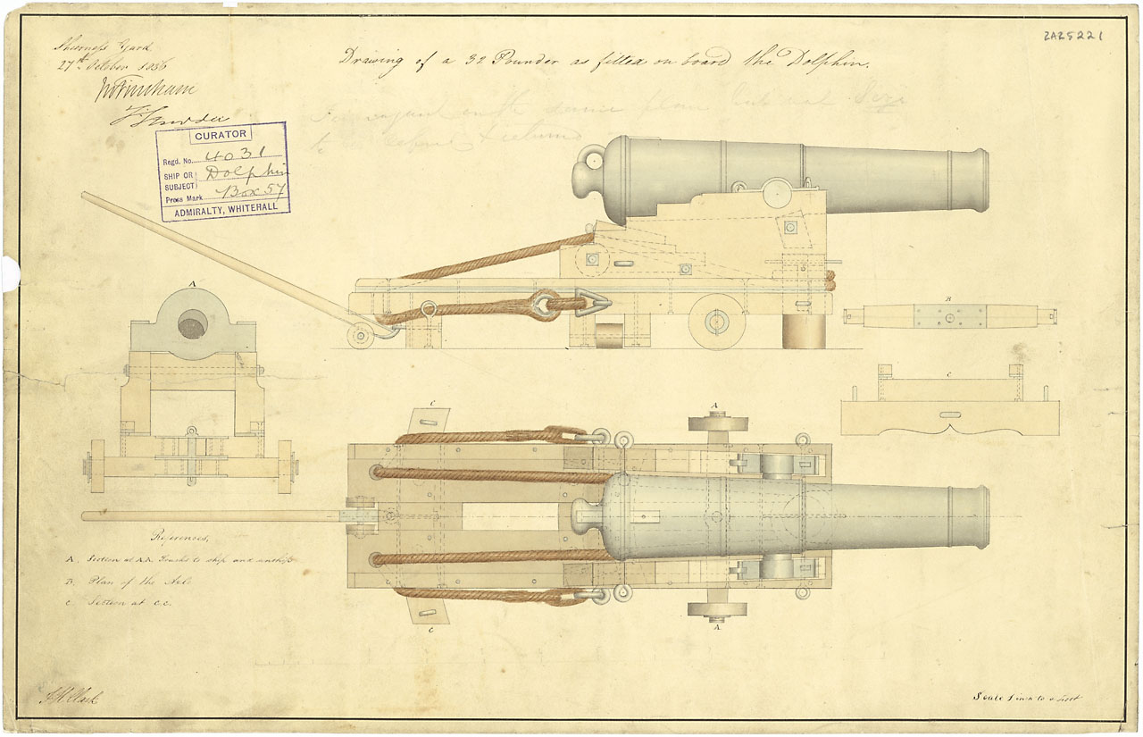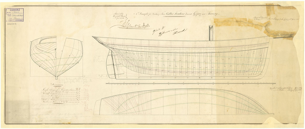 'Basilisk' (1822); 'Sparrow' (1828). Scale: 1:48. Plan showing the inboard profile for 'Basilisk' (1822), a 6/10-gun Cutter, as re-rigged and fitted as a ketch at Chatham Dockyard in April 1835. The plans was also used for fi