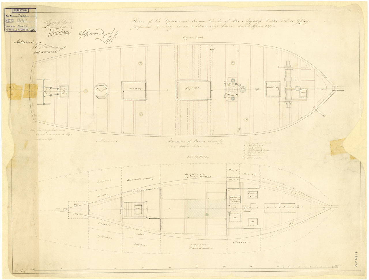 'Basilisk' (1822). Scale: 1:48. Plan showing the upper deck, and lower deck for 'Basilisk' (1822), a 6/10-gun Cutter, re-rigged as a ketch at Chatham Dockyard.
