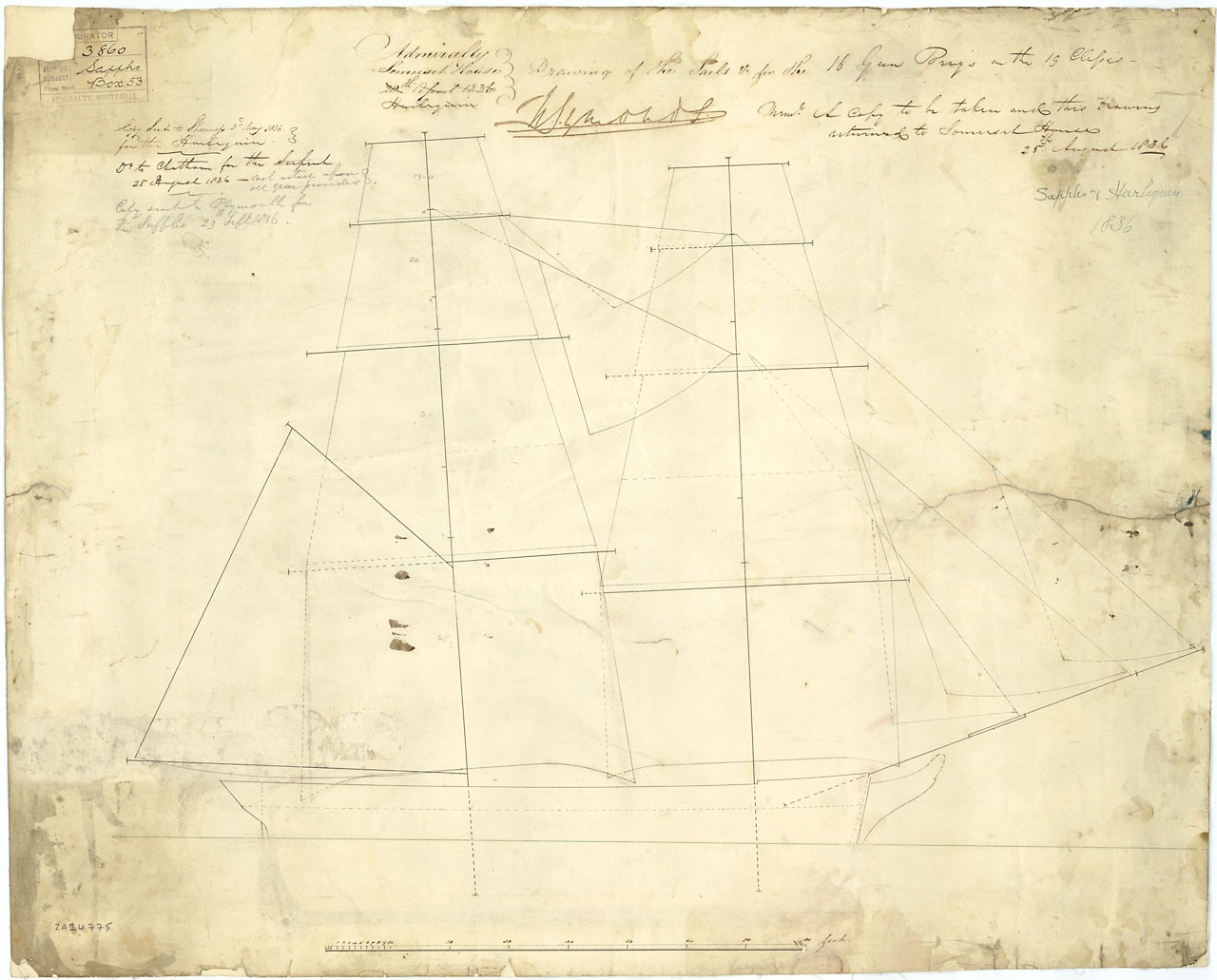 Hart (fl.1836). Scale: 1:96. Plan showing the sail plan for the Hart (fl.1836), a Tender. The plan includes a table of Yard and Mast dimensions. Signed J. Peck [Master Shipwright].