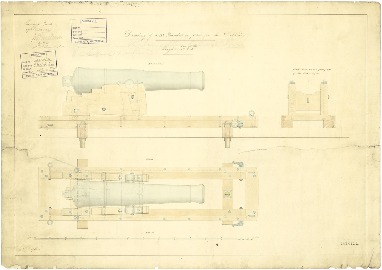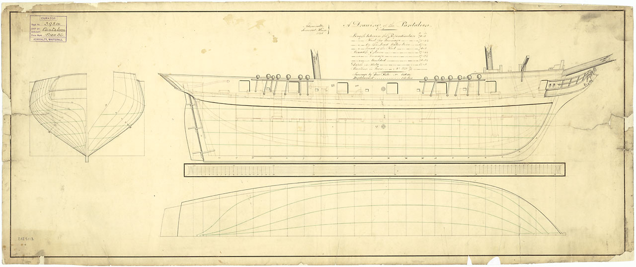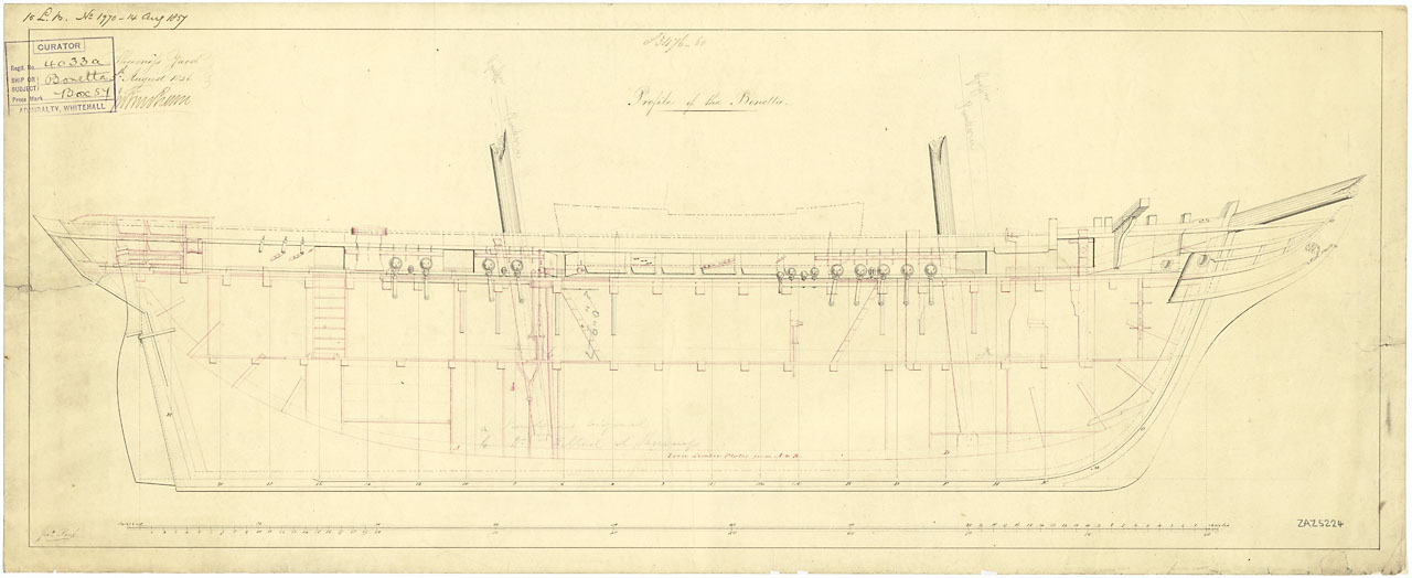 Vanguard (1835). Scale: 1:48. Plan showing the inboard profile with fitting details for Vanguard (1835), an 80-gun Second Rate, two-decker, as fitted at Portsmouth Dockyard.