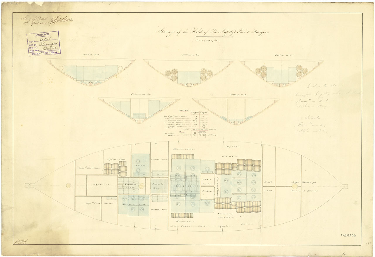 Vanguard (1835). Scale: 1:48. Plan showing the orlop deck with elevations of fittings for Vanguard (1835), an 80-gun Second Rate, two-decker, as fitted at Portsmouth Dockyard.
