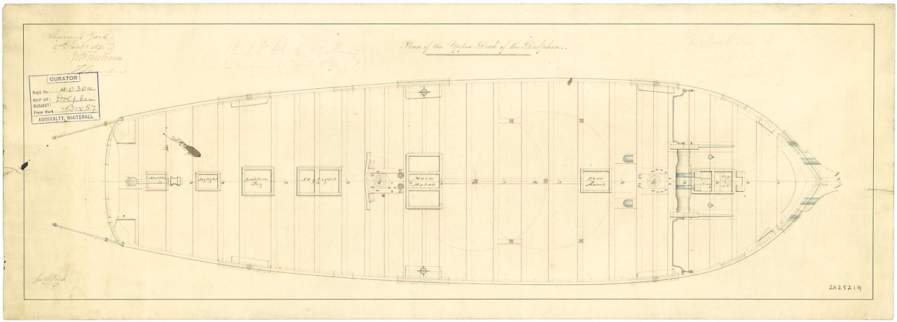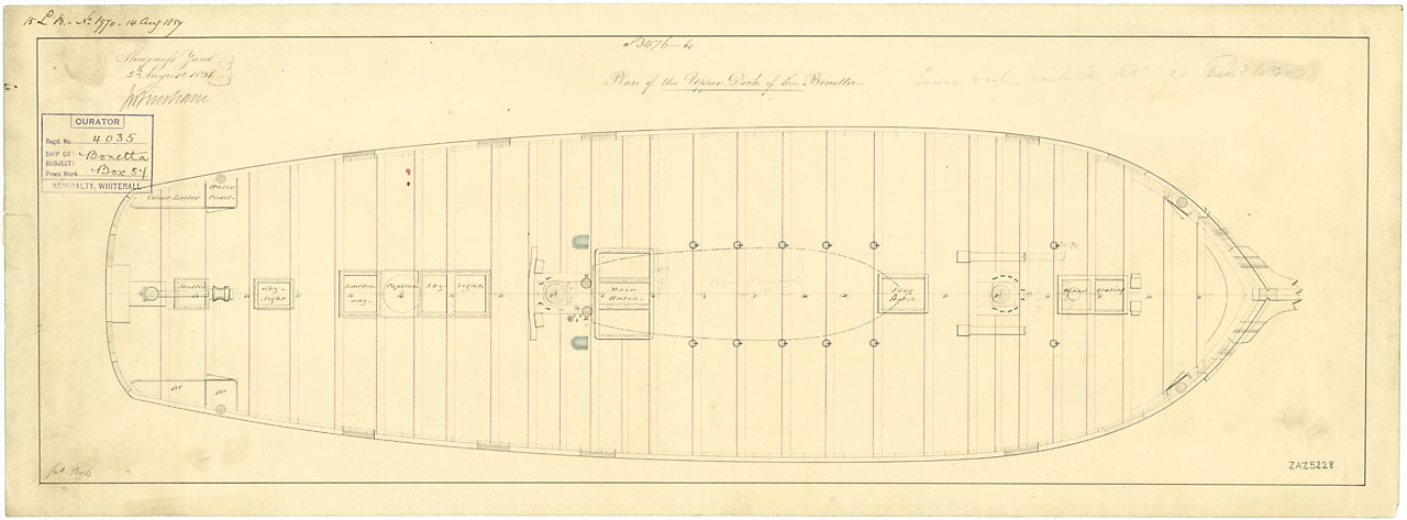 Vanguard (1835). Scale: 1:48. Plan showing the upper deck with elevations illustrating the ring and eye bolts for guns, and the cupboards in the sickbay, for Vanguard (1835), an 80-gun Second Rate, two-decker, as fitted at Portsmouth Dockyard.