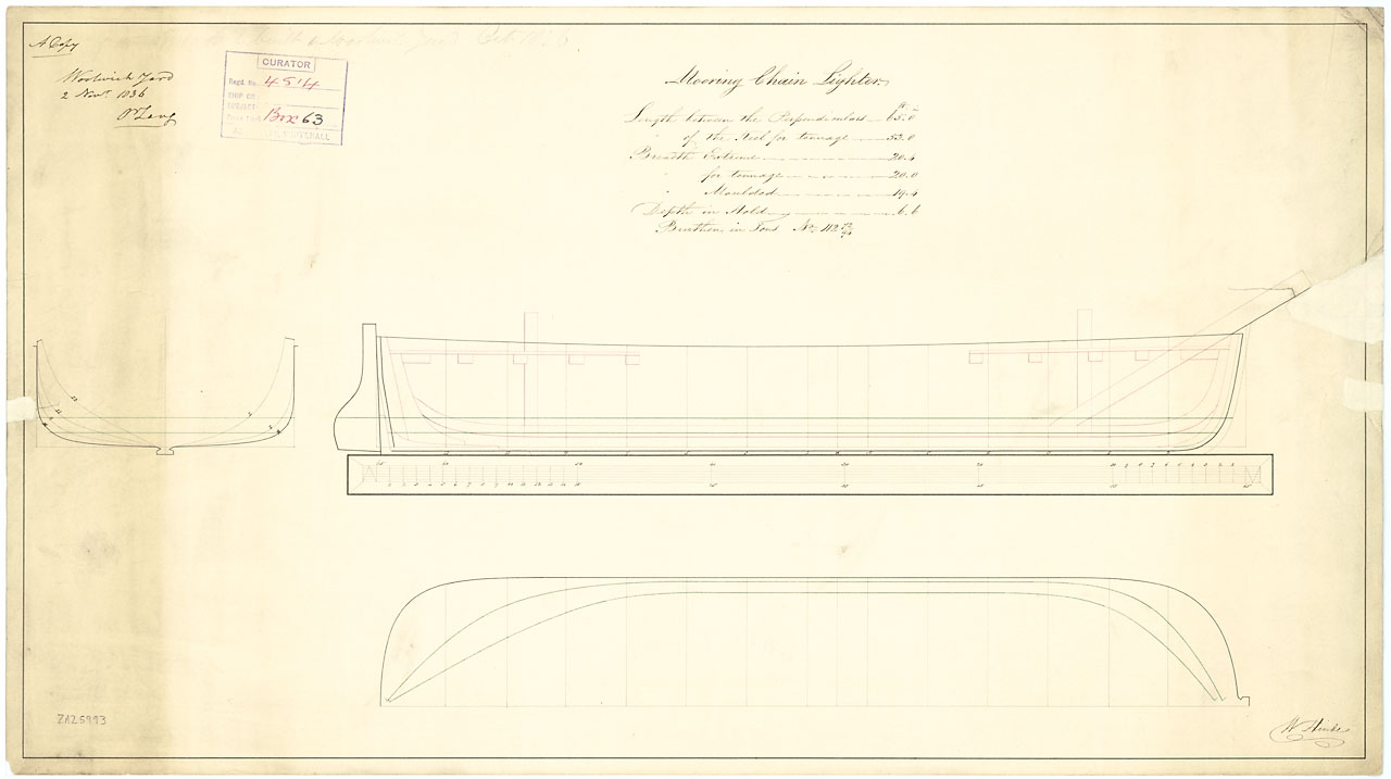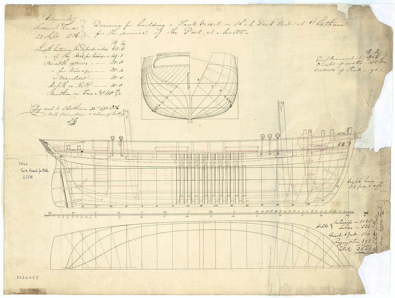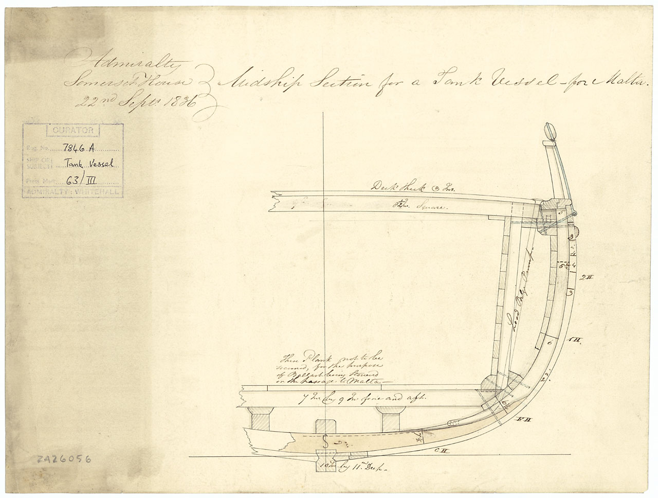 Tank Vessel No. 1 (1837). Scale: 1:24. A plan showing the midship section for Tank Vessel No. 1 (1837), a two-masted Water Carrier built for service in Malta.
