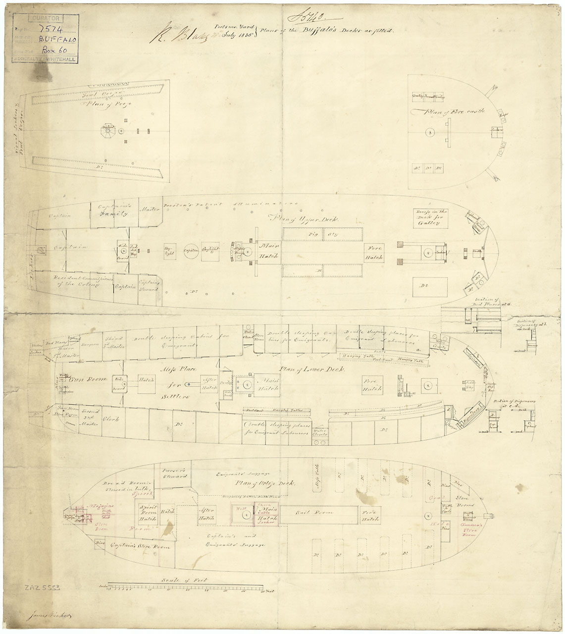 'Buffalo' (1813). Scale: 1:96. A plan showing the poop and forecastle decks, upper deck, lower deck, and orlop deck with sections of bed spaces and dispensaries for 'Buffalo' (1813), a purchased East Indiaman, as fitted for an emigran