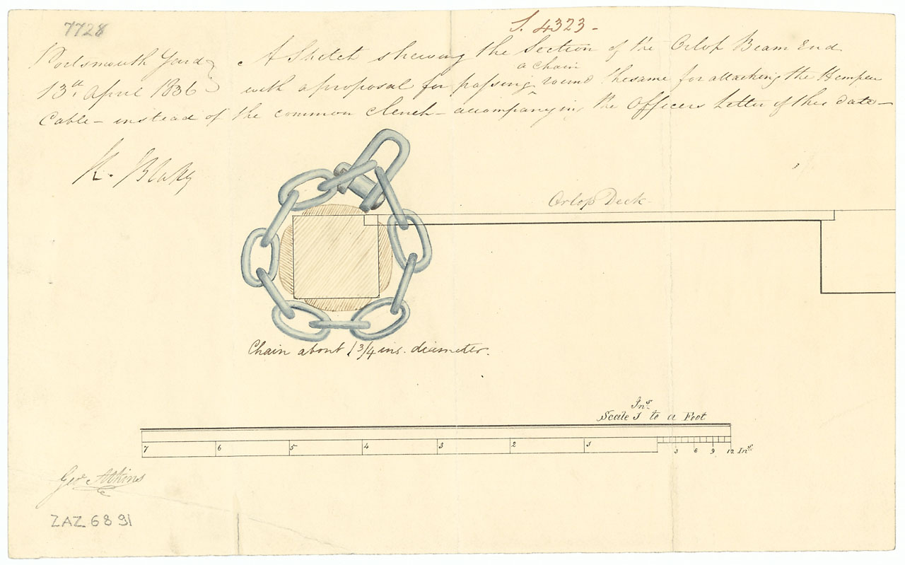 Proposal for a chain shackle attachment. Scale: 1:12. Plan showing a section through an Orlop Deck beam end with a proposal for passing a chain and shackle round the beam for attaching the Hempen cable, instead of the common clench.