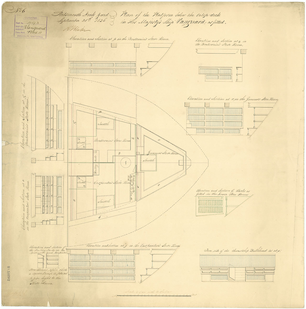 Vanguard (1835). Scale: 1:48. Plan showing the forward platform, with elevations of the carpenter's and boatswain's storerooms, for Vanguard (1835), an 80-gun Second Rate, two-decker, as fitted at Portsmouth Dockyard.